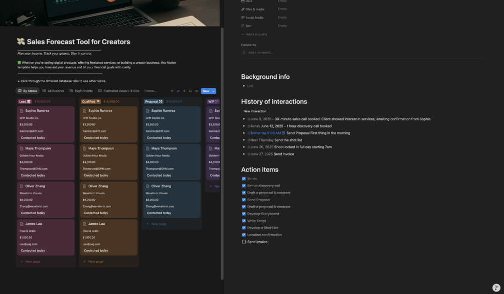 - Detailed Client Profiles: Keep track of crucial contact info, including emails, phone numbers, and job titles, all in one place.